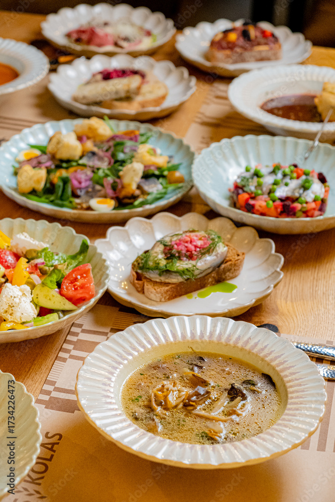 Colorful dishes are artfully arranged on a wooden table, displaying diverse flavors and textures
