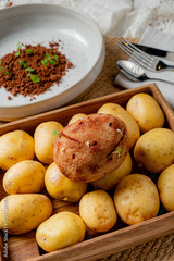 Delicious golden potatoes surround a perfectly baked potato, garnished with fresh herbs