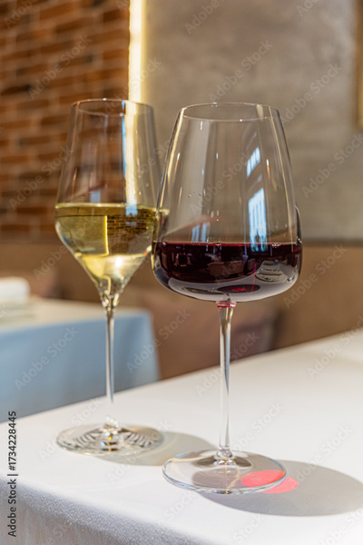 Two beautiful wine glasses filled with white and red wine sit elegantly on the table