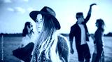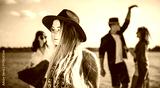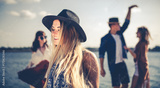 Group of friends dancing and celebrating on beach, boho party