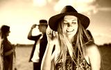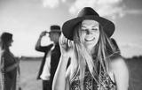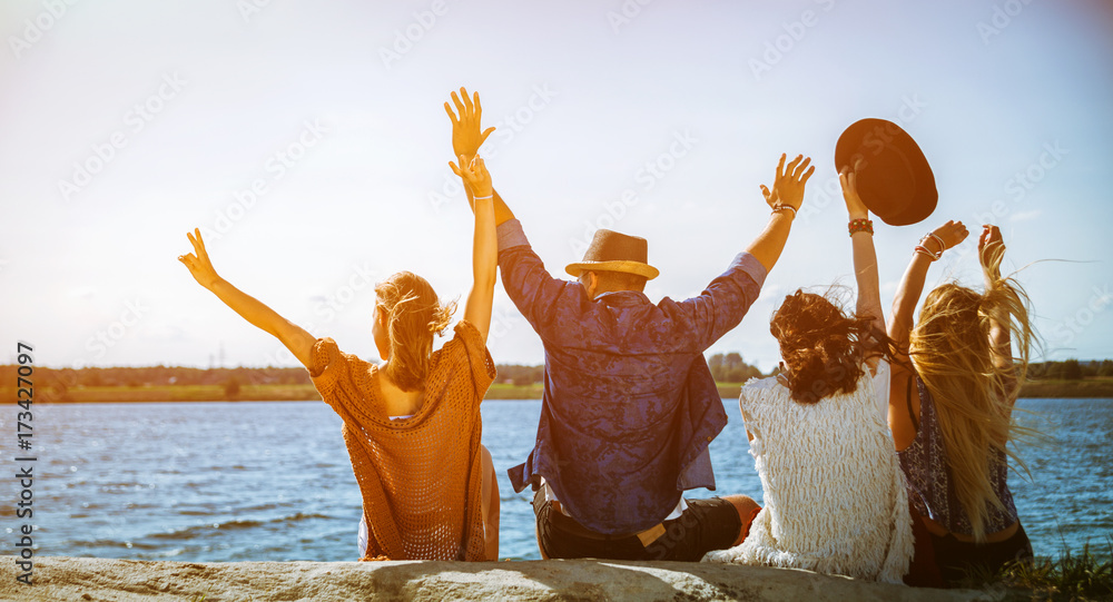 Group of friends dancing and celebrating on beach, boho party