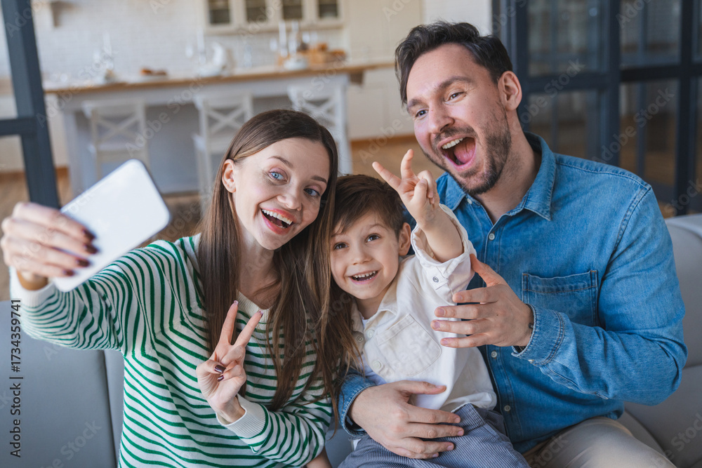 Caucasian family, selfie and happy on couch, relax at home with social media, streaming and memory with commitment. Smile in picture, post and love, care and trust, people in cozy apartment