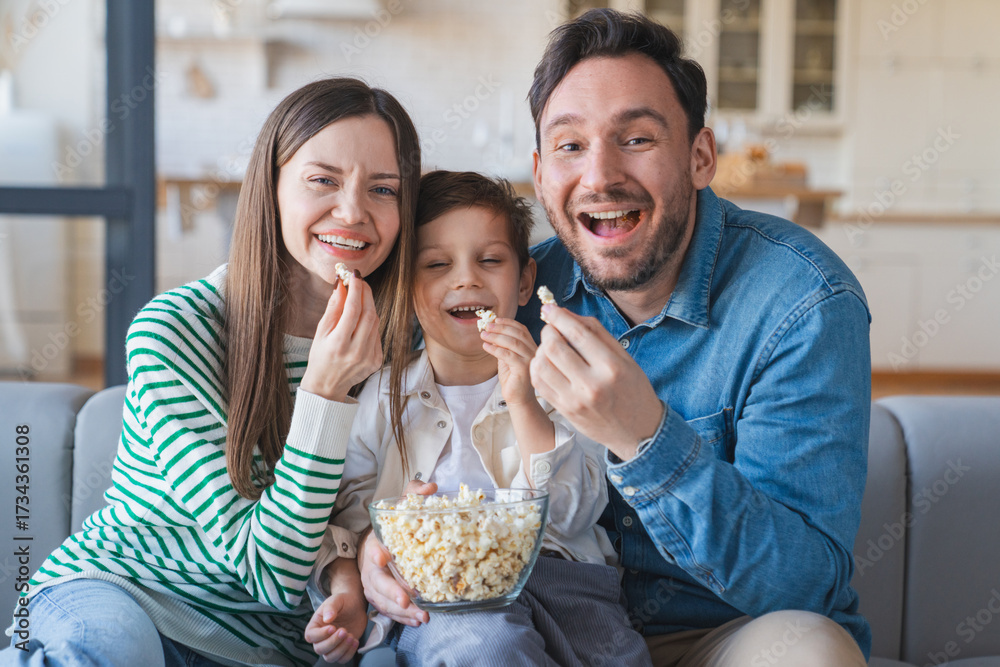 Front view of Caucasian family of three, happy smiling father, mother and little son watching tv movies cartoon film and eating popcorn at home. Leisure and people, streaming services concept