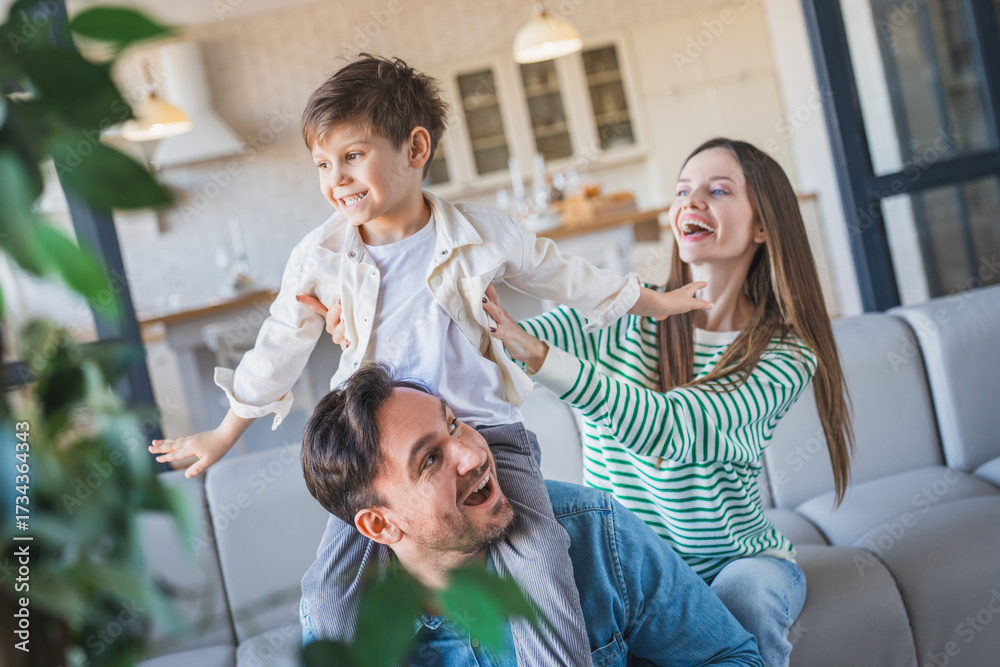 Cheerful little boy sitting on father shoulder while playing with mother at home. Happy Caucasian family enjoying weekend. Young smiling parents enjoying spending time with kid on the living room