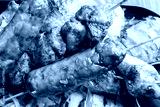 Assorted grilled meats on a plate including sausages, skewers, and bacon-wrapped pieces, garnished with herbs and onions. Rustic, hearty barbecue meal, ideal for culinary and food themes