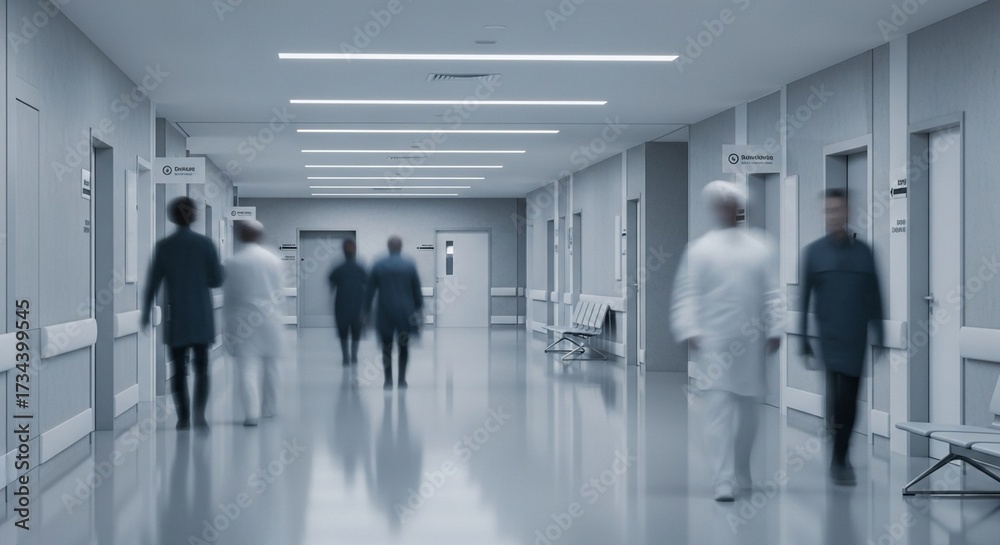 Modern Blurred Hospital Corridor with Medical Personnel and Clean Environment