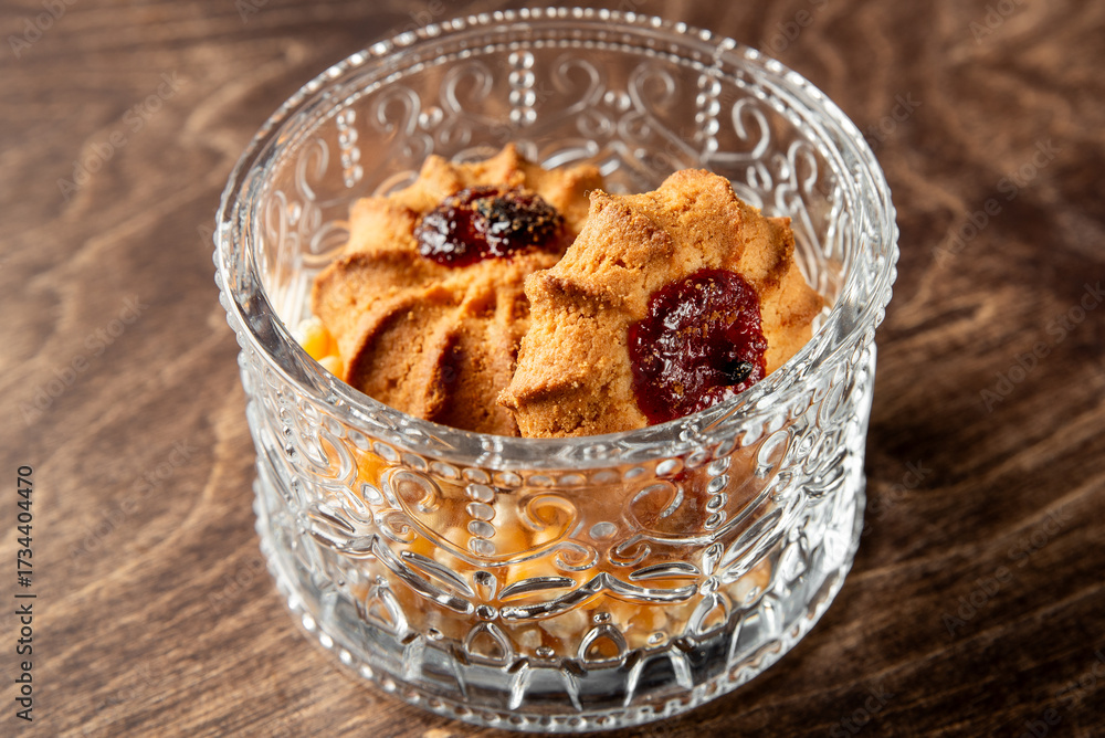 Golden flower-shaped cookies with red jam centers in an ornate glass bowl on rustic wood. Close-up food photography for bakery, dessert, or hospitality themes