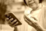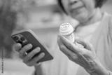 asian senior woman using smartphone searching prescription on bottle medicine,pill label about information online and video call with doctor.Health care technology and telemedicine telehealth concept