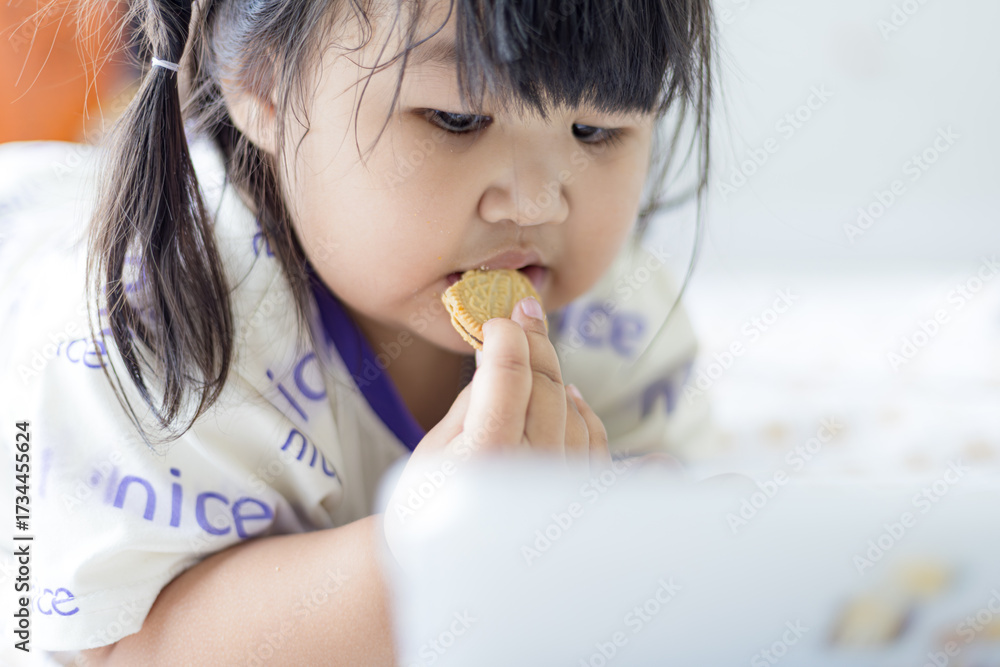 A cute little Asian girl is lying on the bed eating cookies,A little girl in a white dress sits on a comfortable bed, holding a cookie in front of her, smiling and blinking her eyes playfully.