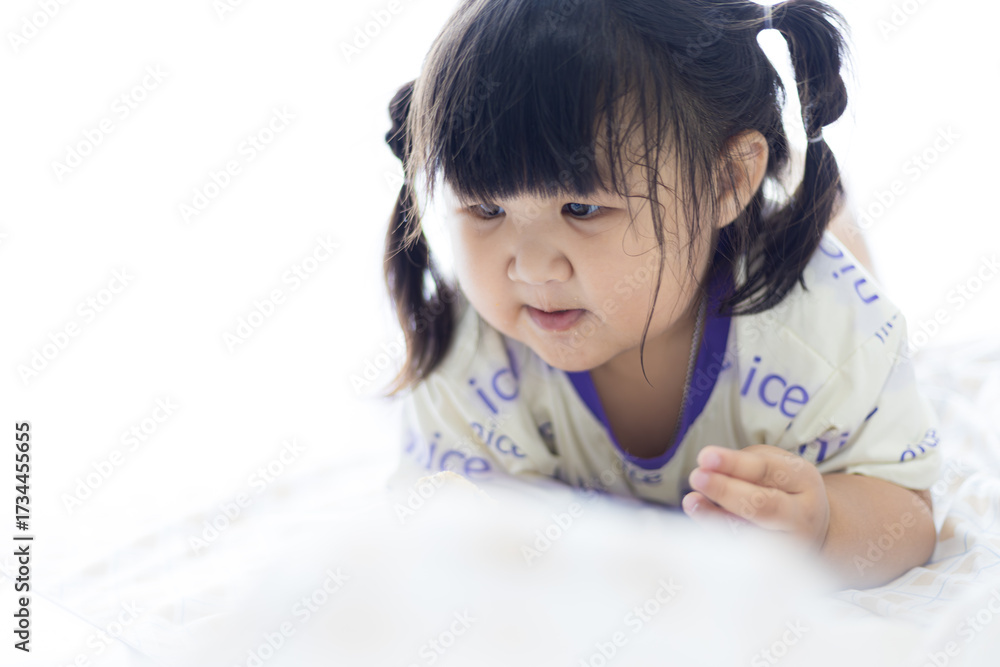 A cute little Asian girl is lying on the bed eating cookies,A little girl in a white dress sits on a comfortable bed, holding a cookie in front of her, smiling and blinking her eyes playfully.