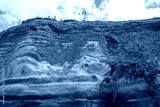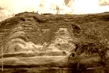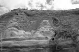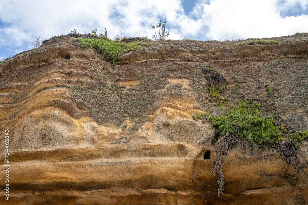 Coastal cliff of Santa Barbara Beach in the Azores with visible geological strata and vegetation growing on its slopes
