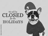 We will be closed for the Holidays. Signboard with inscription. Cute dog and Santa hat. Closeup, indoors. Studio shot. Blue isolated background. Pets care concept