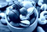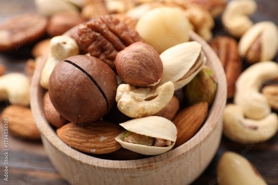 Mix of different nuts on table, closeup