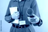 Journalist with microphone, notebook and pen on light background, closeup