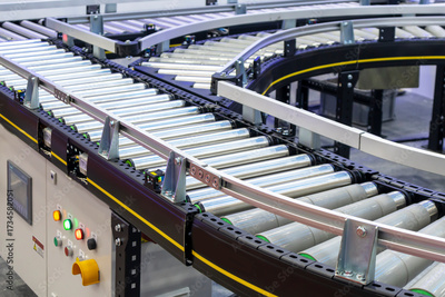 The machinery system for delivering goods in the material warehouse with a sliding mechanism, in a focus view on the sliding equipment.