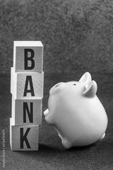 Piggy bank tipping toward the "BANK" blocks suggests customers, short on cash