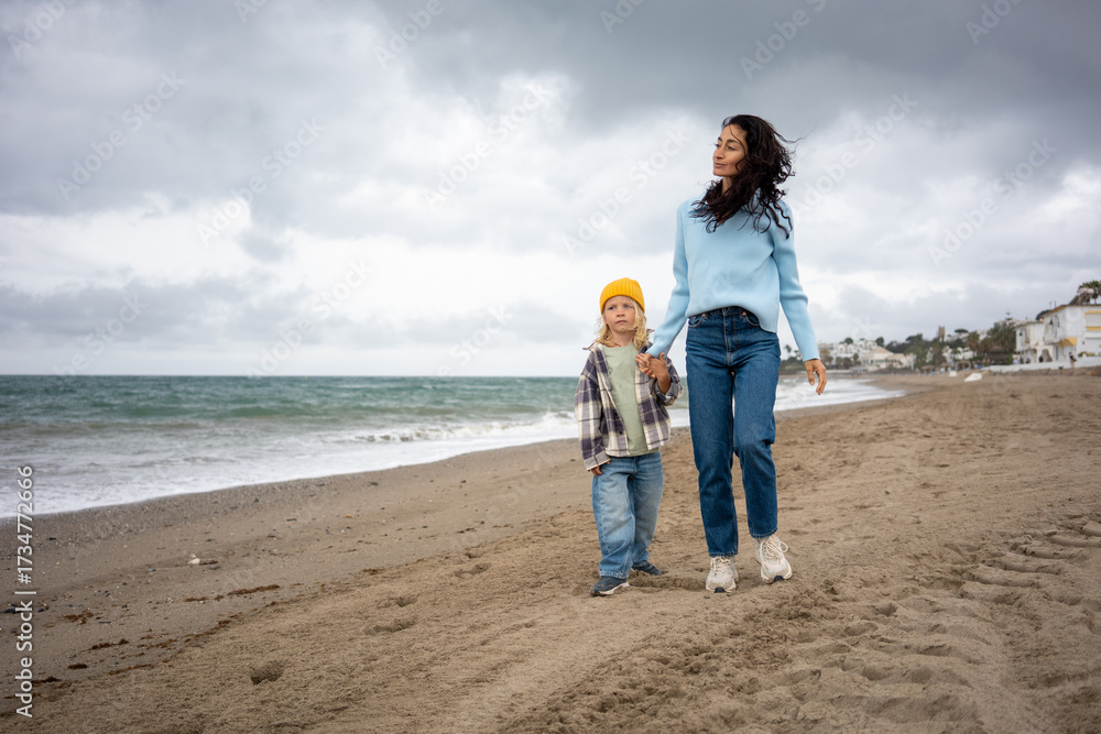 Mother and son walking hand in hand along the sandy beach, woman in blue sweater and boy in plaid shirt with yellow beanie, enjoying a peaceful moment by the sea under cloudy skies
