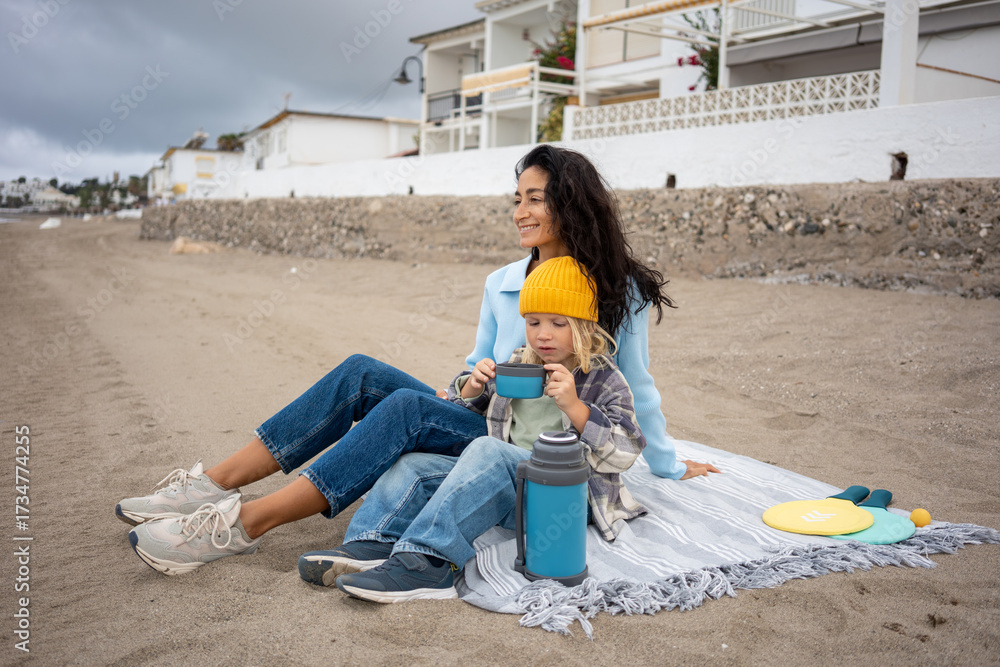 Happy mother and son sitting on a blanket at the beach, drinking warm tea from a thermos on a chilly day with rackets and ball lying nearby