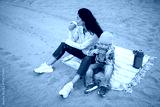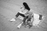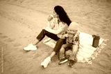 Mother and son sitting on a blanket at the beach, relaxing with hot drinks from a thermos on a cool day