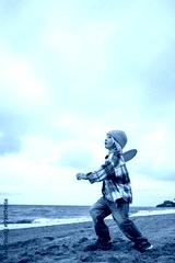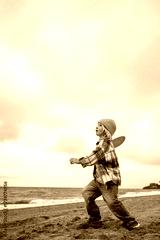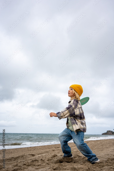 Blond boy in yellow beanie and checkered jacket playing paddle ball on sandy beach, holding turquoise racket while looking up with focus on a cloudy seaside day