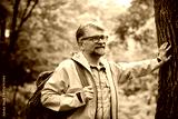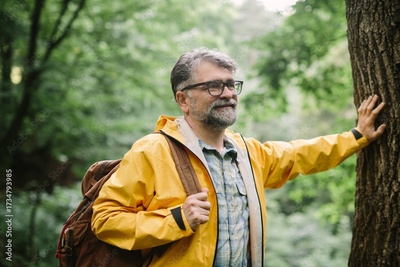 Mature man enjoying nature in green forest