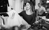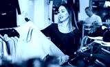 Customer in store has removed hanger with woman hoodie from window and is considering product. Young woman dreams of buying, presents wardrobe update