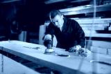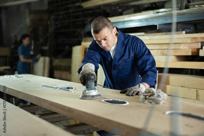 During manufacture of product, male employee grinds surface of wooden board, gives smoothness to surface and prepares material for manufacture of furniture