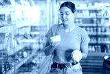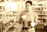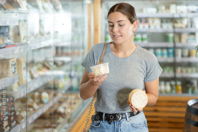 Female customer in bio food store holds cheese of different varieties in hands and is thinking about buying. She inspects unfamiliar product in eco supermarket.