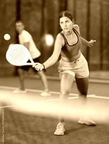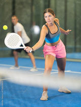 Young woman and young man playing doubles tennis on tennis court