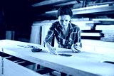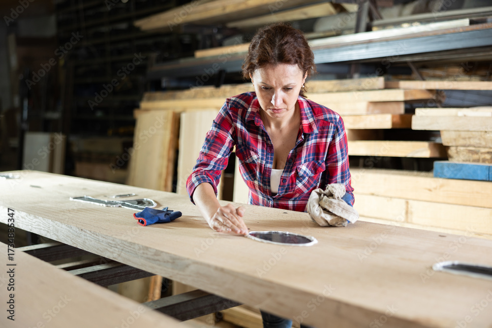 Sad and confused female employee examines defects on wooden board. Owner of carpentry workshop laments poor-quality work and poor material.