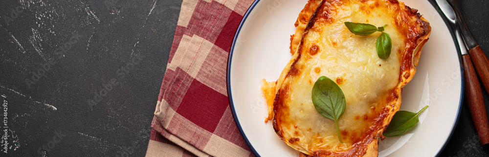 Lasagna, traditional dish of Italy, baked with rich tomato sauce and melted cheese, garnished with fresh basil leaves, a delicious meal on a dark background, copy space