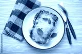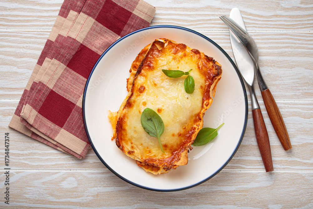 Lasagna with rich bolognese sauce, melted cheese, and fresh basil on a white plate, served on white plate on a light wooden background with a checkered napkin and fork