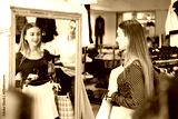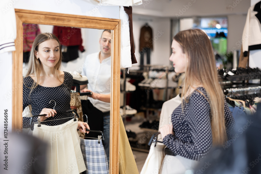 Girl stands in front of mirror hold hanger with skirt, puts it to herself and admires her reflection. Thinking about buying new clothes, shopping, fitting room, spring wardrobe update.