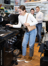 Before buying grill, girl inspect goods in garden supplies store, examine individual parts of mobile grill. Buyer doubt and think about purchasing roaster, chooses suitable device from range of store
