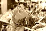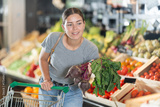 In vegetable department of bio supermarket, female customer took bunch of beetroots from window. Girl buys fresh vegetables for cooking