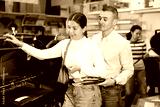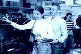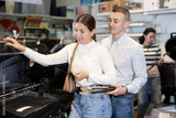 Young married couple chooses a new grill in a supermarket for their yard