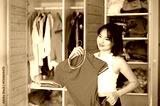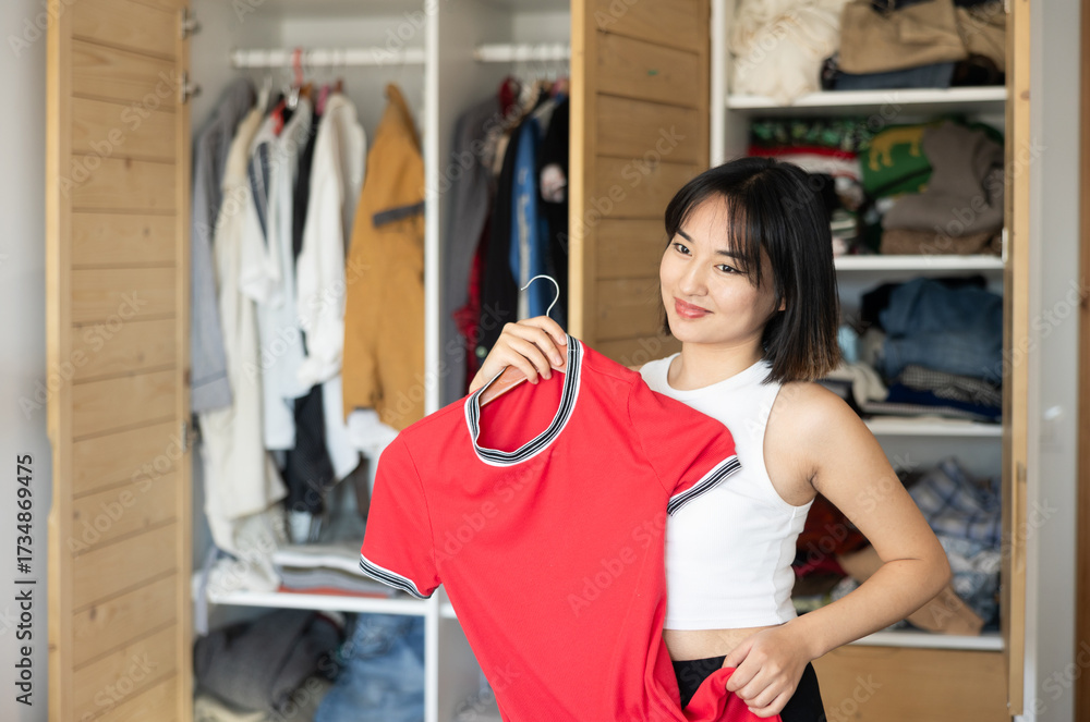 Pleased young Asian lady standing in front of wardrobe deciding which clothing to prefer