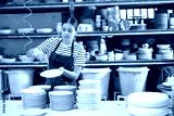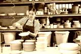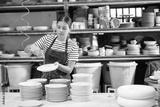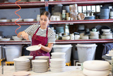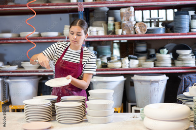 Concentrated young female potter using air gun to remove dust from freshly made ceramic plates, standing at workplace in pottery workshop filled with various ware
