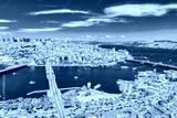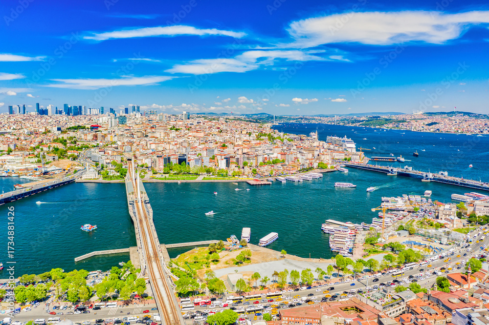 Drone aerial view of Istanbul districts Beyoglu and Karakoy Beyoglu with blue sky. Istanbul, Turkiye