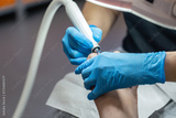 Podologist does pedicure in a beauty clinic. Podiatry concept. Foot treatment in the spa.