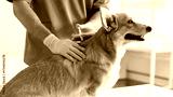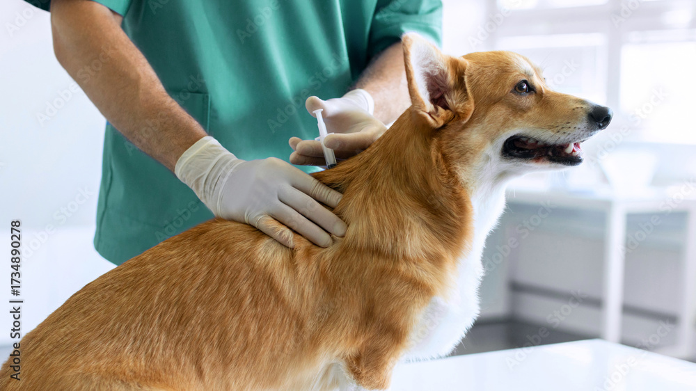 Pembroke Welsh Corgi dog getting vaccine injection during appointment in private veterinary clinic, man veterinarian making an injection to pet, panorama