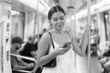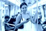 Positive young girl standing on underground wagon holding mobile phone in hand