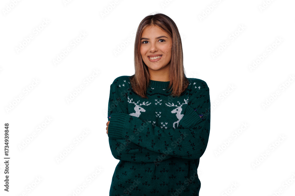 Young woman wearing festive green christmas reindeer sweater, smiling at camera, embracing holiday spirit on transparent background