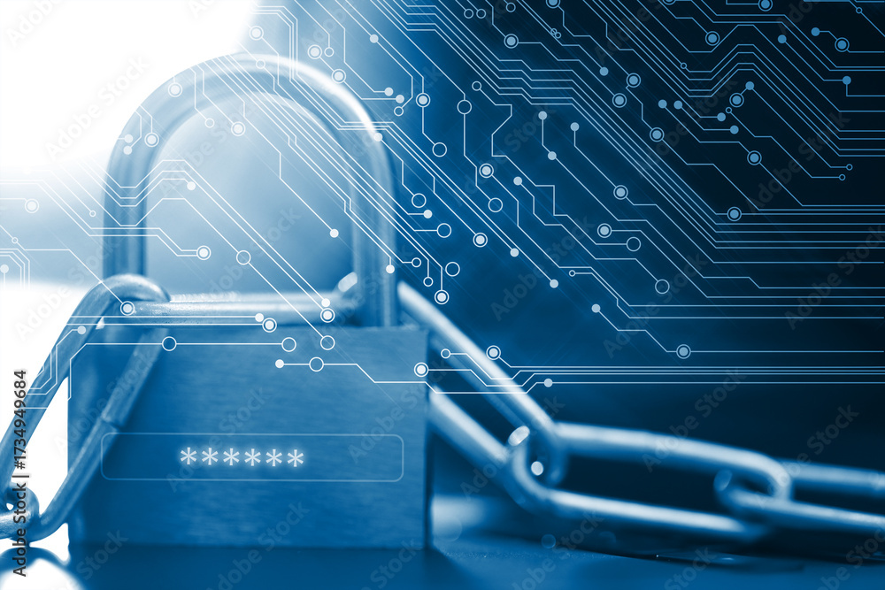 Padlock with digital password asterisks and chain on laptop, toned in blue. Circuit board pattern. Cyber security