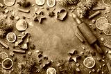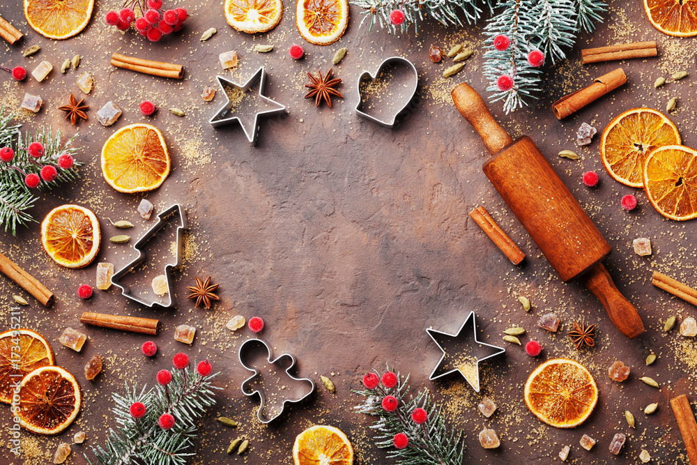 Holiday food background for baking gingerbread cookies with cutters, rolling pin and spices on vintage table top view. Copy space for christmas recipe.