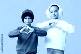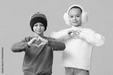 Cute little happy children in warm winter clothes showing hearts gesture on yellow background
