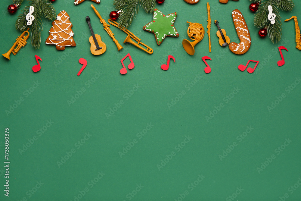 Composition with Christmas cookies, decorations, note signs and decorative musical instruments on green background