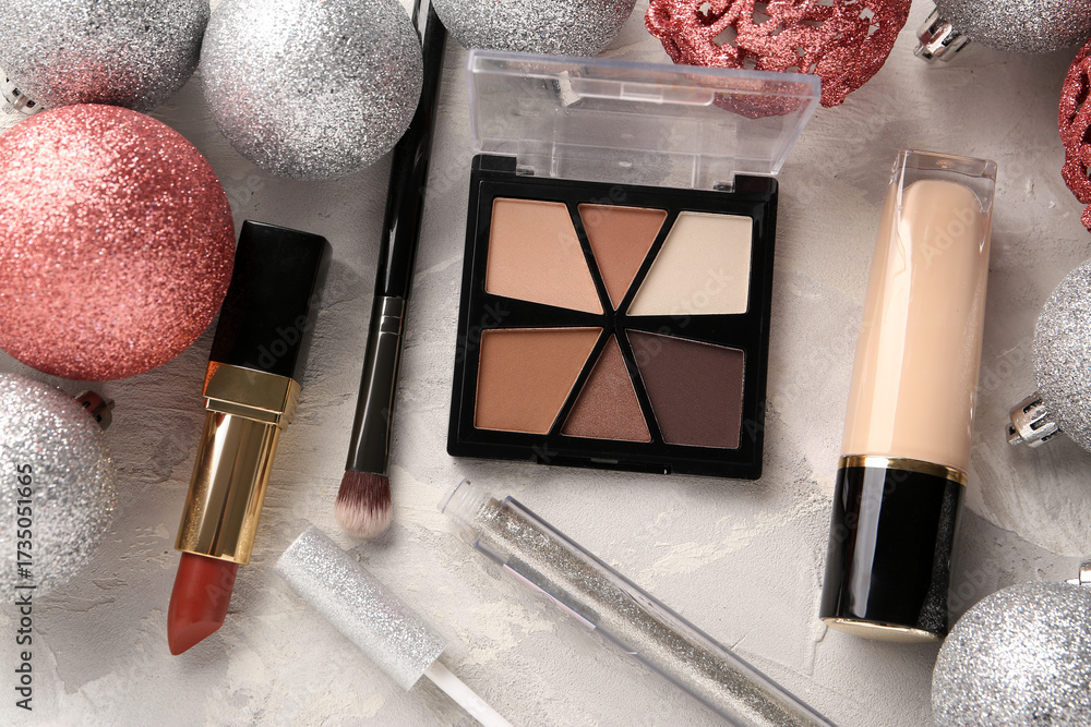 Beautiful composition with Christmas balls and decorative cosmetics on grunge background, closeup