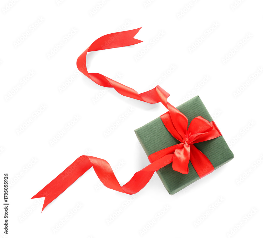 Beautiful gift box with red ribbon for Christmas celebration on white background