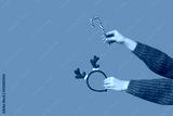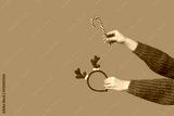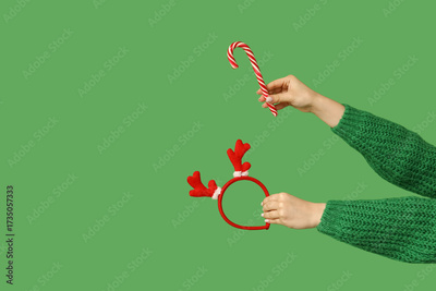 Female hands with Christmas reindeer horns headband and candy cane on green background
